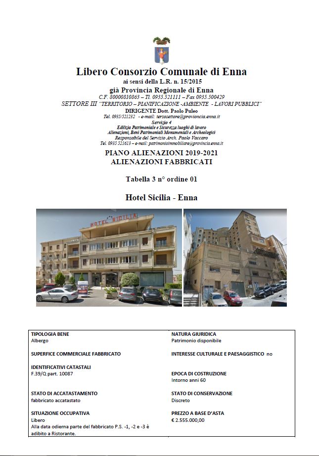 Si informa che in esecuzione della deliberazione del Commissario Straordinario con i poteri del Consiglio Provinciale n. 8 del 16/07/2019, di approvazione del Piano delle Alienazioni e valorizzazione del Patrimonio immobiliare 2019/2020 ed alla Determina Dirigenziale del 3° Settore n. 1426 del 16/09/2019 di approvazione del bando di asta pubblica per l’alienazione dell’immobile denominato “GRANDE ALBERGO SICILIA DI ENNA”.